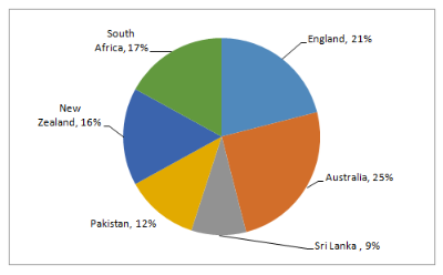The pie chart given below shows the runs scored by a player against 6 different countries. The total runs scored by the player against these countries are 1600.