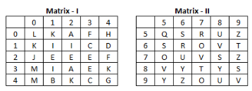 A word is represented by only one set of numbers as given in any one of the alternatives. The sets of numbers given in the alternatives are represented by two classes of alphabets as shown in the given two matrices. The columns and rows of Matrix-I are numbered from 0 to 4 and that of Matrix-II are numbered from 5 to 9. A letter from these matrices can be represented first by its row and next by its column, for example 'K' can be represented by 42, 34 etc and 'Z' can be represented by 96, 79 etc. Similarly, you have to identify the set for the word 'ROAD'.