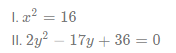 In these questions, two equations numbered I and II are given. You have to solve both the equations and select the appropriate option.