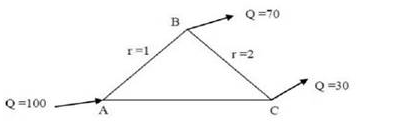 The head loss in each pipe is given bwith the variables expressed in a consistent set of units. The value of r for the pipe AB is 1 and for the pipe BC is 2. If the discharge supplied at the point A (i.e., 100) is equally divided between the pipes AB and AC, the value of r (up to two decimal places) for the pipe AC should be ____________