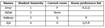 Students applying for hostel rooms are allotted rooms in order of seniority. Students already staying in a room will move if they get a room in their preferred list. Preferences of lower ranked applicants are ignored during allocation. Given the data below, which room will Ajit stay in?