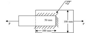 The permissible stresses in the plate and the weld are 150 MPa and 110 MPa, respectively. Assuming the length of the weld shown in the figure to be the effective length, the permissible load P (in KN) is