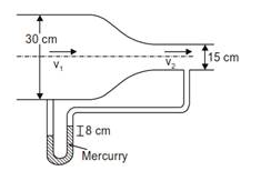A circular duct carrying water gradually contracts from a diameter of 30cm to 15cm. The figure (not drawn to scale) shows the arrangement of differential manometer attached to the duct.