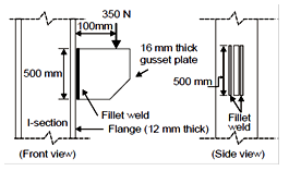 A 16 mm thick gusset plate is connected to the 12 mm thick flange plate of an I-section using fillet welds on both sides as shown in the figure (not drawn to scale). The gusset plate is subjected to a point load of 350 kN acting at a distance of 100 mm from the flange plate. Size of fillet weld is 10 mm