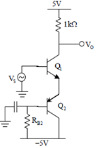 In the circuit shown, transistors Q1 and Q2 are biased at a collector current of 2.6mA. If transistor current gains are sufficiently large to assume collector current equal to emitter current and thermal voltage of 26 mV, the magnitude of voltage gain V0/Vs in the mid-band frequency range is __________ (up to second decimal place).