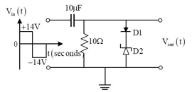In the figure, D1 is a real silicon pn junction diode with a drop of 0.7V under forward bias condition and D2 is a zener diode with breakdown voltage of -6.8 V. The input Vin(t) is a periodic square wave of period T, whose one period is shown in the figure.