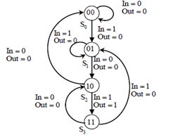 The state diagram of a finite state machine (FSM) designed to detect an overlapping sequence of three bits is shown in the figure. The FSM has an input „In‟ and an output ‘Out’. The initial state of the FSM is S0.