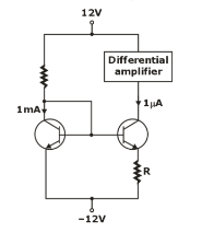 The circuit shown in the figure uses matched transistors with a thermal voltage VT = 25 mV. The base currents of the transistors are negligible. The value of the resistance R in kΩ that is required to provide 1μ-A, bias current for the differential amplifier block shown is ______.