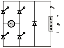 A single-phase fully controlled rectifier is supplying a load with an anti-parallel diode as shown in the figure. All switches and diodes are ideal. Which one of the following is true for instantaneous load voltage and current?