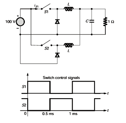 The figure shows two buck converters connected in parallel. The common input dc voltage for the converters has a value of 100 V. The converters have inductors of identical value. The load resistance is  The capacitor voltage has negligible ripple. Both converters operate in the continuous conduction mode. The switching frequency is 1 kHz, and the switch control signals are as shown. The circuit operates in the steady-state. Assuming that the converters share the load equally, the average value of  the current of switch S1 (in ampere) is ________ (upto 2 decimal places).