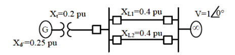 In the single machine infinite bus system shown below, the generator is delivering the real power of 0.8 p.u. at 0.8 power factor lagging to the infinite bus. The power angle of the generator in degrees (round off to one decimal place) is ____________.