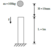 A point mass of 100 kg is dropped onto a massless elastic bar (cross-sectional area  length = 1m, Young’s moduls = 100 GPa) from a height H of 10mm as shown (Figure is not to scale). If , the maximum compression of the elastic bar is _______ mm.