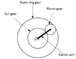 In an epicyclic gear train, shown in the figure, the outer ring gear is fixed, while the sun gear rotates counterclockwise at 100rpm. Let the number of teeth on the sun, planet and outer gears to be 50, 25, and 100, respectively. The ratio of magnitudes of angular velocity of the planet gear to the angular velocity of the carrier arm is _________.