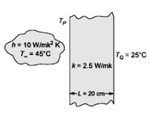A plane slab of thickness L and thermal conductivity k is heated with a fluid on one side  and the other side  is maintained at a constant temperature, TQ of 25°C, as shown in the figure. The fluid is at 45°C and the surface heat transfer coefficient, h, is  The steady state temperature. TP (in °C) of the side which is exposed to the fluid is _________ (correct to two decimal places).