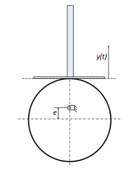 A flat-faced follower is driven using a circular eccentric cam rotating at a constant angular velocity ω. At time t = 0, the vertical position of the follower is y(0) = 0, and the system is in the configuration shown below.