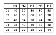 Five jobs (J1, J2, J3, J4 and J5) need to be processed in a factory. Each job can be assigned to any of the five different machines (M1, M2, M3, M4 and M5). The time durations taken (in minutes) by the machines for each of the jobs, are given in the table. However, each job is assigned to a specific machine in such a way that the total processing time is minimum. The total processing time is __________ minutes.