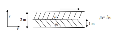 If the dynamic viscosity of the lower fluid, μ2, is twice that of the upper fluid, μ1, then the velocity at the interface (round off to two decimal places) is _________ m/s.