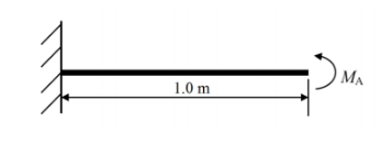 A horizontal cantilever beam of circular cross-section, length 1.0 m and flexural rigidity EI = 200 N.m2 is subjected to an applied moment MA = 1.0 N-m at the free end as shown in the figure. The magnitude of the vertical deflection of the free end is _____________mm (round off to one decimal place).