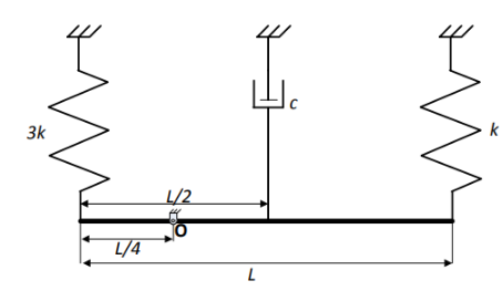 A slender uniform rigid bar of mass m is hinged at O and supported by two springs, with stiffnesses 3k and k, and a damper with damping coefficient c, as shown in the figure. For the system to be critically damped, the ratio c/√km should be