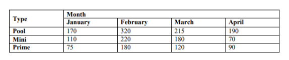 Mola is a digital platform for taxis in a city. It offers three types of rides – Pool, Mini and Prime. The Table below presents the number of rides for the past four months. The platform earns one US dollar per ride. What is the percentage share of revenue contributed by Prime to the total revenues of Mola, for the entire duration?