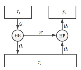 The figure shows a heat engine (HE) working between two reservoirs. The amount of heat (Q2) rejected by the heat engine is drawn by a heat pump (HP). The heat pump receives the entire work output (W) of the heat engine. If temperatures.