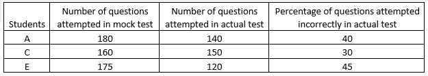If percentage of the number of questions attempted correctly by all the three persons is same for actual as well as mock test, then what is the ratio of the number of incorrect questions attempted by A to number of correct questions attempted by E in the mock test?