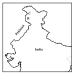 Match the issues with the areas marked in the map as A, B and C and select the correct answer using the code given below :-