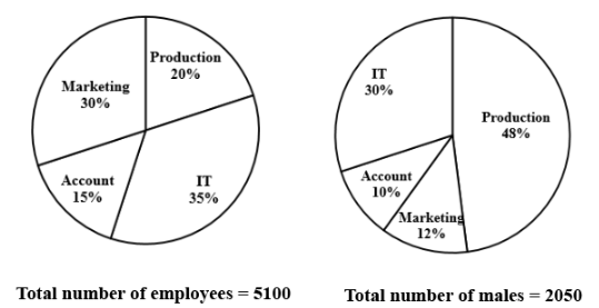 The following pie charts show the percentage of employees in each department and the percentage of males working in each department.
