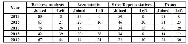 The given table shows the number of new employees joined in different categories of employees in an organization and also the number of employees from these categories who left the organization every year since the foundation of the organization in 2015. Study the table and answer the question that follows.