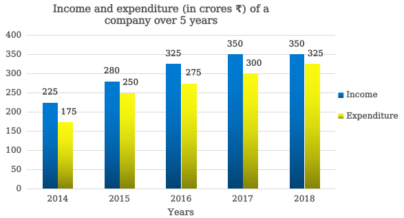 The given bar graph shows the income and expenditure (in crores ₹) of a company over 5 years, from 2014 to 2018.