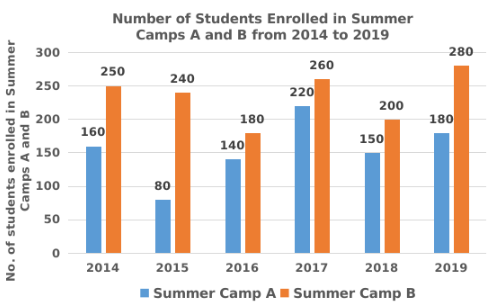 The following bar chart shows the number of students enrolled in two Summer Camps A and B from 2014 to 2019.