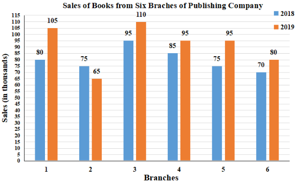 The following bar graph shows the sales of books (in thousands) from six branches of a publishing company during two consecutive years 2018 and 2019.