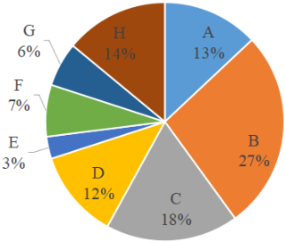The number of trucks sold by B, C, F and H is how much percent less than the number of trucks sold by all these 8 companies?