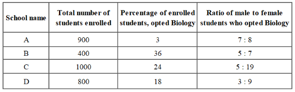 Find the ratio of the number of female students who opted biology in school B and school D .