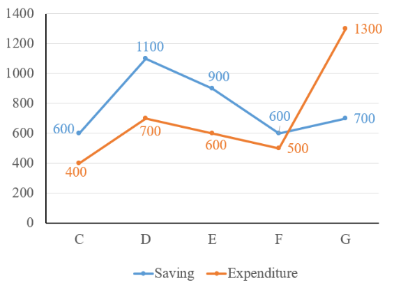 The line chart given below shows the saving and expenditure of 5 companies C, D, E, F and G.