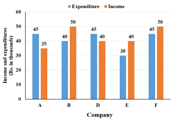 The following bar-graph represents the income and expenditures (Rs.in thousands) of the companies A, B, C, D and E in the year 2021.