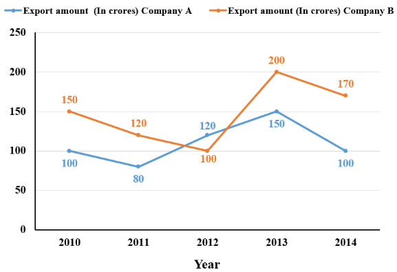 The following line graph shows the export by company A and company B (in crores) over the five years 2010 to 2014.