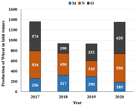 The graph shows the production of when (in lakh tons) by states M, N, and O in four consecutive years. Find the year which has the minimum production of wheat.