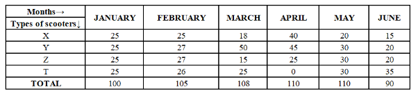 The following table gives the month- wise number of different types of scooters produced by a comapany during the first six months of 1992.
