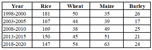 The given table shows the consumption of grains (in kilograms)by a village per day over the given set of year. Study the table and answer the following question. For which set of years (in options) is the combined consumption per day equal to that for the other set of years?