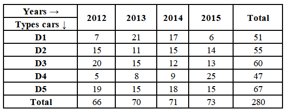 The following table shows the production of five types of cars by a company for the years 2012 to 2015 .