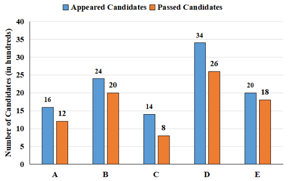 The graph shows the number of appeared candidates and passed candidates (in hundreds') in a test from six different institutions.
