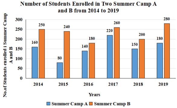 The following Bar Chart shows the number of students enrolled in two Summer Camps A and B from 2014 to 2019.