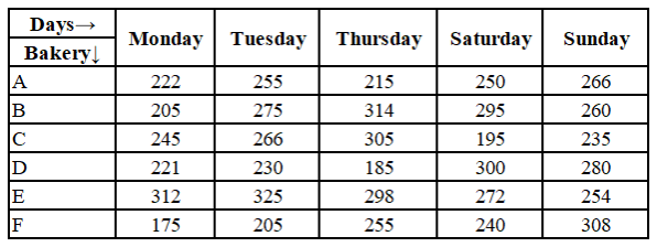 The table below shows the number of cakes sold by six different bakeries in a town on five different days of particular week.
