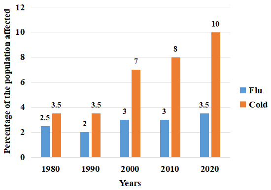 As per data available in the table above. what was the aproximate percentage increase the percentage of the population affected by cold in 2020 when compared to the percentage of the population affected by cold in 1990?