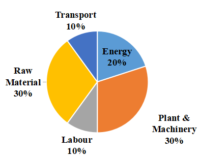 The given pie chart shows the share of labour, raw material, energy, transportation cost. and plant & machinery in the total manufacturing cost of the company during a particular year. Study the pie chart and answer the question that follows.