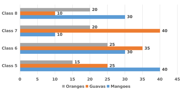The following bar graph shows the data of the number of students of different classes who like to eat different types of fruits.