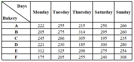 The table below shows the number of cakes sold by six different bakeries in a town on five different days of a particular week.