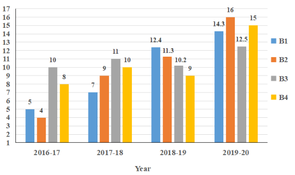 If the sales of a brand is more than the average sales of these four brands in any year, then it gets a star. Which brand has the minimum number of stars from 2016 to 2019?