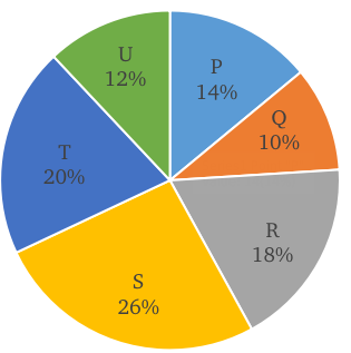 The following pie chart describes the sales of a particular brand of T-shirts in 6 of their outlets P, Q, R, S, T and U. The total sales in which two given outlets exceed the sales in the outlet S?